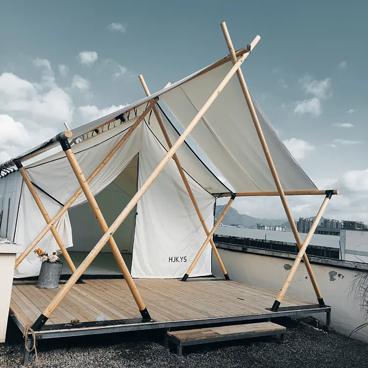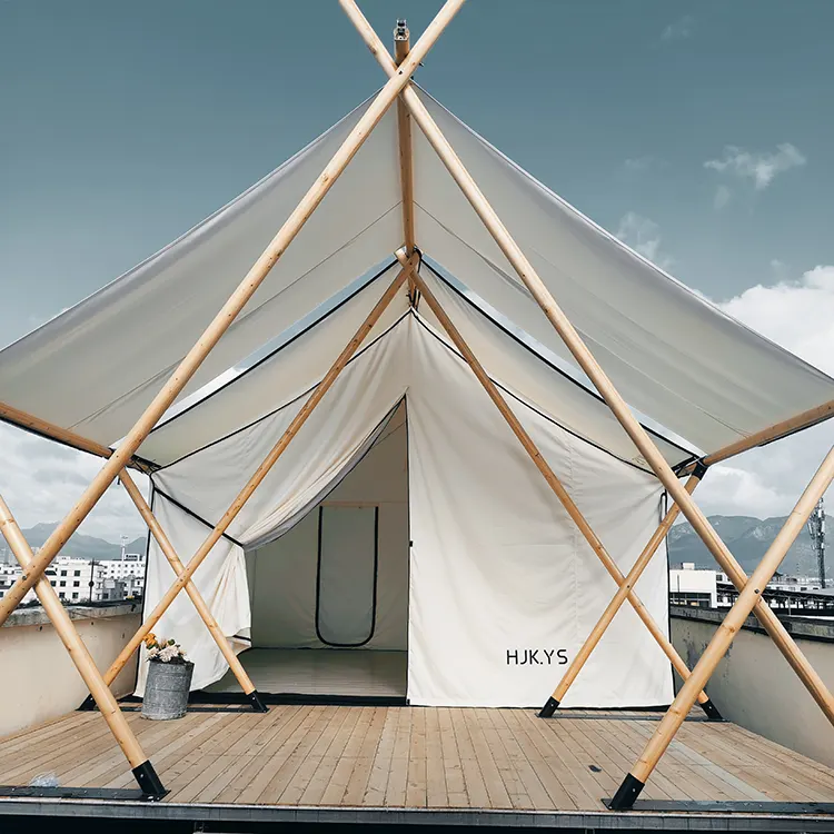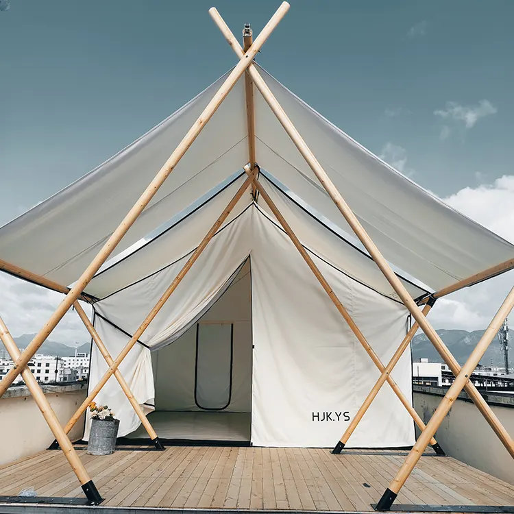 HJK.YS là nhà sản xuất lều đi săn bằng vải canvas hai lớp chống thấm nước hàng đầu Trung Quốc. Chúng tôi cung cấp các giải pháp lều toàn diện cho khách sạn. Lều khách sạn của chúng tôi có khả năng chống gió và có thể được sử dụng với dây thừng chống gió để chống gió mạnh. Có thể tách rời, dễ dựng và có thể tách ra để sử dụng. Chống mưa, chống thấm nước, quy trình kết dính, vải phủ chống thấm nước. Vải Oxford bền, chống mài mòn 900D dán khung gỗ nguyên khối. Thiết kế rèm thoáng khí, thoáng khí giúp tăng cường lưu thông không khí. Nhiệt độ không đổi, vải chải kỹ mật độ cao, thoải mái và không oi bức. Lều khách sạn này có thiết kế rèm đôi, vải chống thấm chất lượng cao, không gian trong nhà rộng rãi và kết cấu cột gỗ chắc chắn được dán chắc chắn. Không gian rộng không bị giới hạn, diện tích tổng thể khoảng 5x8≈40 mét vuông, không gian trong suốt và không bị chặn, thiên nhiên ôm ấp sâu lắng. Dù là sự kiện xây dựng nhóm của công ty hay đoàn tụ với bạn bè, lều khách sạn của chúng tôi mang đến khung cảnh hoàn hảo cho một buổi hẹn hò trải nghiệm nhóm đáng nhớ.